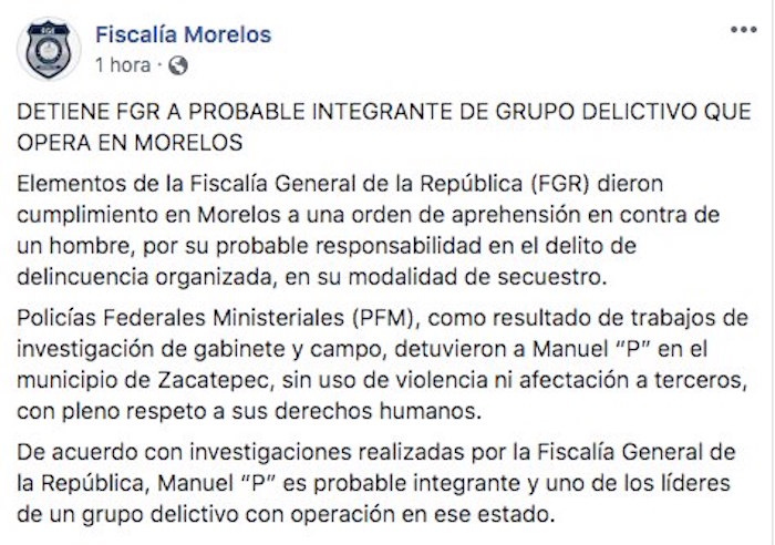 Manuel “P” fue detenido en el municipio de Zacatepec, Morelos, sin uso de violencia por el delito de delincuencia organizada, en la modalidad de secuestro."El Manolo" es investigado por los delitos de delincuencia organizada, en la modalidad de secuestro.