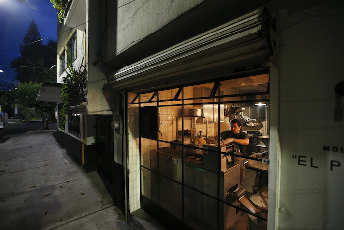 En éste, el último espacio que el chef más famoso del país abrió en la capital, las mesas y los decorados elegantes no existen. Aquí los clientes hacen fila ante un mostrador para realizar sus pedidos y comen de pie o en bancas metálicas frente a una modesta barra de madera. Desde que la vida de este local arranca a las cinco de la mañana y se extingue pasadas las cinco de la tarde, el único protagonista es el maíz. Las tortillas se preparan diariamente, cuando el pecho ronco del molino transforma varios kilos de granos en masa caliente y una vez que están listas permiten saborear trozos de campo e historia local.