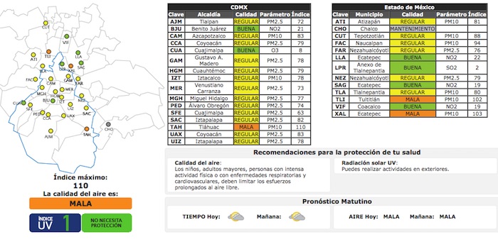 En su reporte de las 08:00 horas, el Simat informó que Tláhuac registra el punto más alto de contaminantes con 110 unidades. Mientras en Benito Juárez y Cuajimalpa, la calidad del aire es buena.