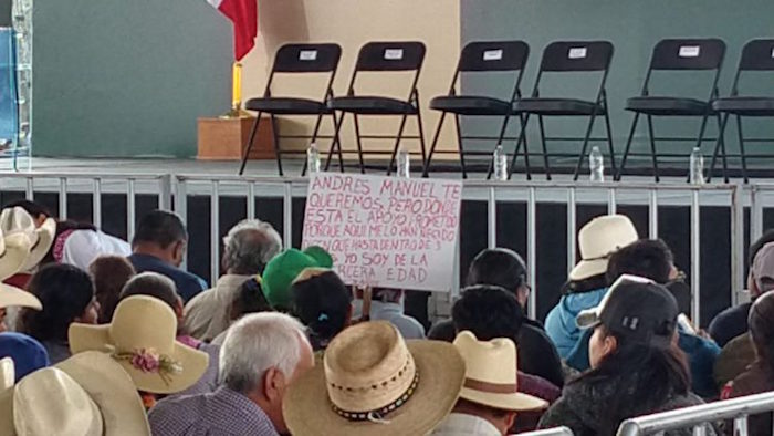 “Andrés Manuel te queremos pero dónde está el apoyo prometido, aquí me lo han negado, me dicen que hasta de tres meses”, decía el cartel.