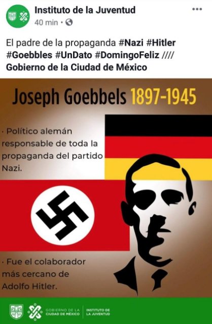 Ciudad de México, 27 de mayo (Vanguardia).- El Instituto de la Juventud (Injuve) de la Ciudad de México publicó ayer a manera de efeméride una ilustración sobre Joseph Goebbles, considerado padre de la propaganda nazi.