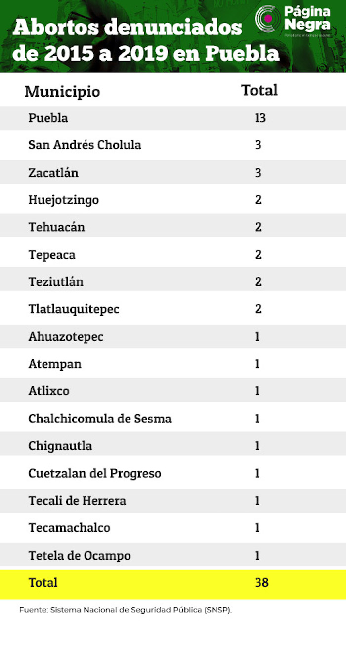 El Sistema Nacional de Seguridad Pública tiene documentados 38 casos de mujeres que han sido perseguidas por abortar. Esta cifra se ha registrado desde 2015 a abril de 2019. Hace cuatro años se registraron siete casos; para el año siguiente la cantidad subió a 13. Sin embargo, a partir del 2017, las denuncias disminuyeron pues se reportaron nueve, posteriormente cinco y hasta abril de este año se han contabilizado cuatro denuncias por casos de aborto en Puebla.