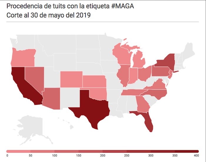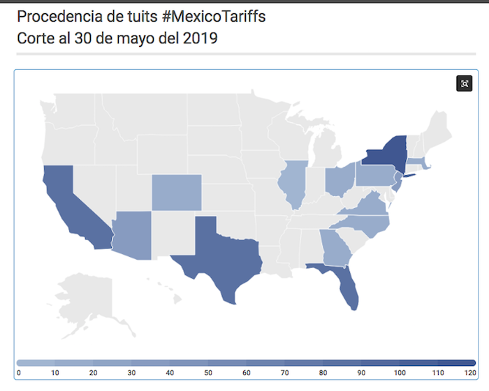 En la muestra recolectada de los tuits con la etiqueta #MexicoTariffs y #MAGA coincidieron que procedían de Texas California, Florida y Nueva York, así como de Washington, DC, Arizona, Nevada y Carolina del Norte.