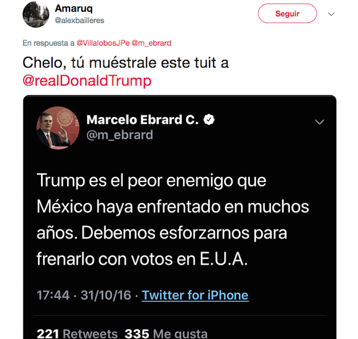 Sin embargo, en la vorágine desatada por Trump y sus posibles consecuencias negativas sobre México, un grupo de opositores insiste desde las redes sociales, principalmente en Twitter, en exhibir la supuesta debilidad del también ex Jefe de Gobierno de la Ciudad de México. Entre sus acciones destaca la difusión de varios tuits que Ebrard publicó en 2016, en el marco del periodo electoral estadounidense y en los consideró a Trump como un peligro para México.