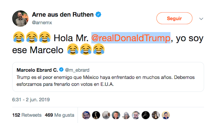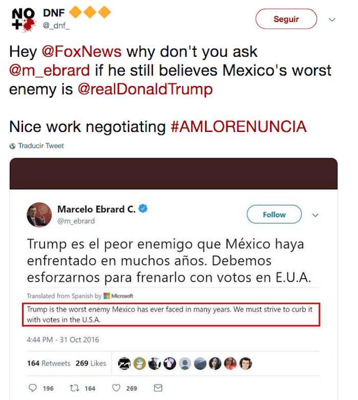 Su estrategia para atacar a Ebrard y los esfuerzos del Gobierno de México ha sido revivir tuits que el hoy Canciller lanzó en octubre de 2016 contra Trump, entonces candidato del Partido Republicano a la Presidencia, y además etiquetarlos a las cuentas oficiales del empresario neoyorquino y de la Casa Blanca, con la intención de exhibirlo y mostrarlo como un enemigo.