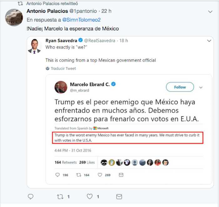 El tuit del 31 de octubre no fue el único que revivieron los opositores al actual Gobierno federal. Otro, publicado el 28 de octubre de 2016, también fue usado por mexicanos para exhibir al Canciller como un enemigo de Donald Trump.