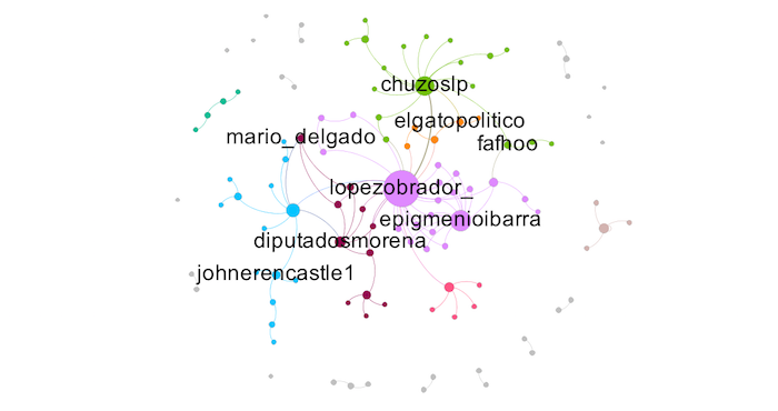 Usarios de Twitter que articularon la movilización en apoyo al Presidente Andrés Manuel López Obrador el jueves 6 de junio del 2019. En el gráfico se observa una red de usuarios que concentraron numerosas menciones en Twitter. Foto: SinEmbargo