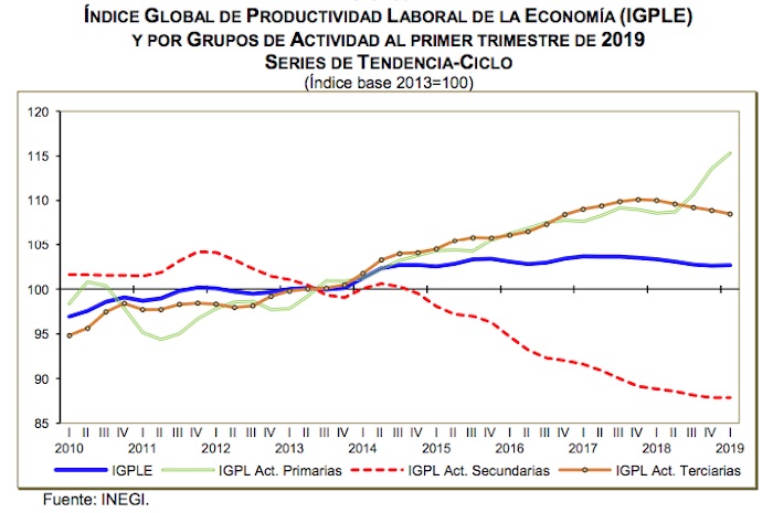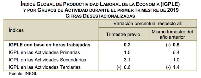 Ciudad de México, 10 de junio (Economía Hoy).- En el periodo enero-marzo de este año, el Índice Global de Productividad Laboral de la Economía (IGPLE) por hora trabajada mostró un nivel de 102.8 puntos, con un incremento de 0.2 por ciento con respecto al último trimestre de 2018 y luego de cuatro trimestres con retrocesos.
