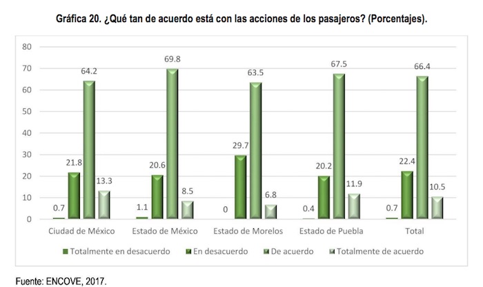 El 64.2 por ciento de los capitalinos, el 63.5 por ciento de los morelenses, el 69.8 por ciento de los mexiquenses, y el 67.5 por ciento de los poblanos respondieron que estaban de acuerdo con el actuar de los pasajeros asaltados.