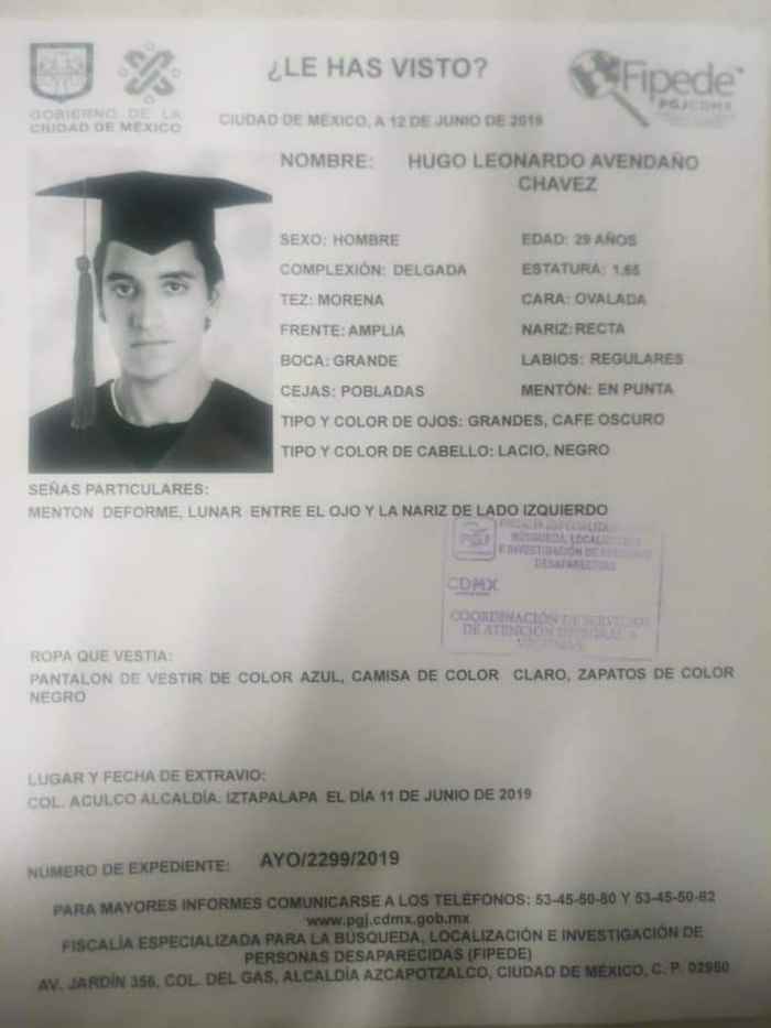 “No encuentro las palabras para expresar el dolor que mi familia está pasando en estos momentos, el día martes 11 de junio aproximadamente a las 23:00 hrs mi primo Leonardo Avendaño fue privado de su libertad, el día de ayer nos avisaron que lo encontraron sin vida dentro de su camioneta con signos de tortura y asfixia, por si fuera poco, la burocracia hace de las suyas, llevamos horas y horas de trámites y malos tratos, porque no sólo se es víctima una vez, aquí lo eres miles de veces”, publicó una de sus familiares en su perfil de Facebook.