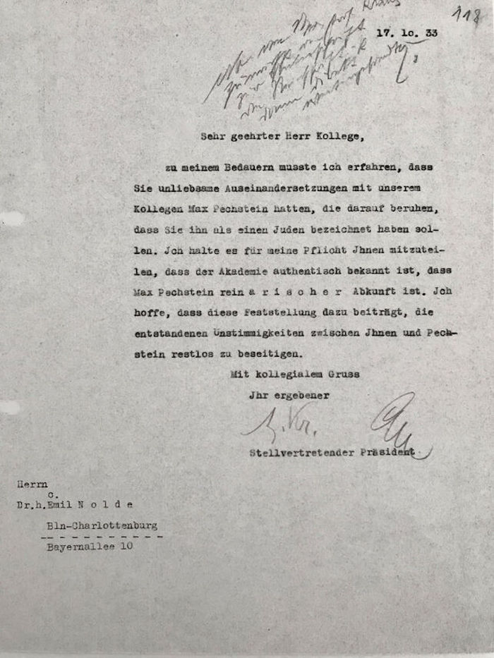 Nolde fue muy lejos en su compromiso con el nacionalsocialismo. Llegó a denunciar a su colega el artista Max Pechstein por ser judío al ministerio de Goebbels. Le respondería la Academia de las Artes confirmando que Pechstein era un "ario puro". Al Nolde denunciante solo se le entiende en base a su fuerte antisemitismo, sobre el que se informa ampliamente en la muestra.