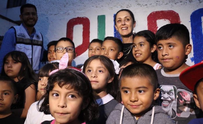Para el mural, niños y niñas de la zona se sumaron a Sheinbaum para plasmar su manos con pinturas de colores en la pared.