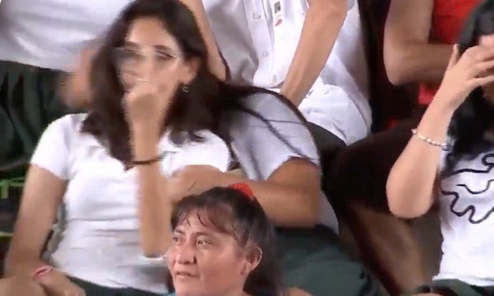 ¿De qué se ríen?", preguntó el Jefe del Ejecutivo al ver la actitud de los jóvenes. "...¿qué hay en la pantalla?, ¡ah! que aparecen ustedes... a ver, paneen más", pidió AMLO, y al hacerlo, la cámara captó a una joven hacer la seña.