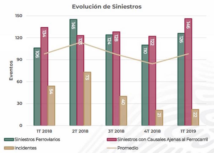 Esta categoría alcanzó durante primer trimestre de 2019 su valor más alto en épocas recientes, con un total de 371 incidencias, lo que corresponde con un crecimiento intertrimestral de 32.97 por ciento, según datos del Sistema Ferroviario Mexicano.
