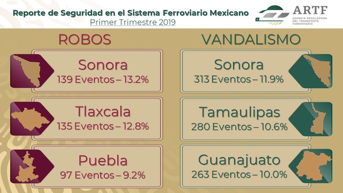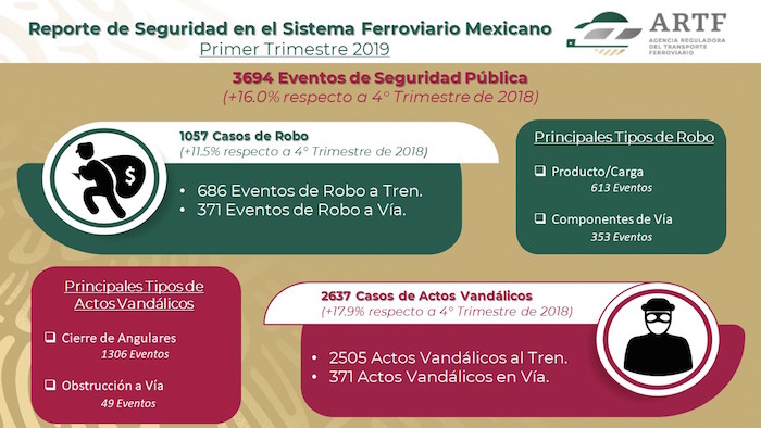 El reporte revela que el primer trimestre de 2019 se registró un total de 3 mil 694 casos de inseguridad en el sistema ferroviario mexicano, de los cuales se tienen 1,057 robos y 2 mil 637 actos vandálicos, un incremento de 11.50 por ciento y 17.93 por ciento, respectivamente, respecto al cuarto trimestre de 2018.