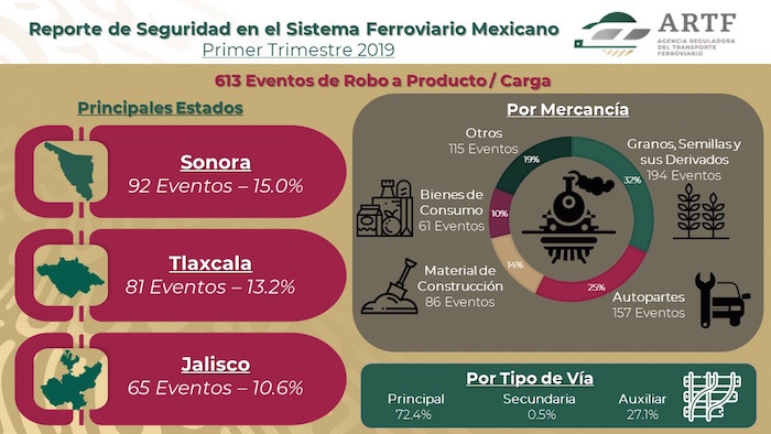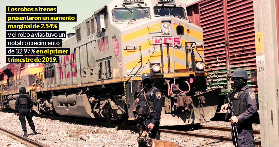 El primer trimestre de 2019 se registró un total de 3 mil 694 casos de inseguridad en el sistema ferroviario mexicano, de los cuales se tienen 1,057 robos y 2 mil 637 actos vandálicos, según datos de la SCT. Los productos mas robados por los delincuentes son: granos, semillas y sus derivados, autopartes y material de construcción.