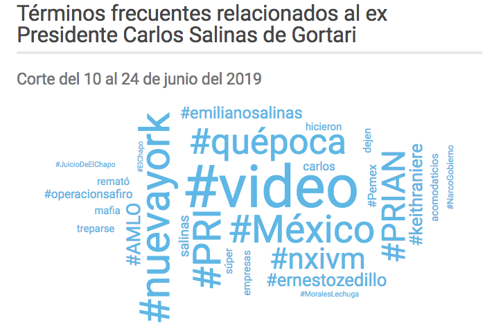 En la muestra recolectada, Carlos Salinas de Gortari presenta numerosas menciones en donde se le relaciona con la secta NXIVM debido a que su hijo Emiliano Salinas Ocelli fue miembro activo de esta organización, cuyo líder, el estadounidense Keith Rainere, fue procesado por pedofilia en los Estados Unidos en días pasados.