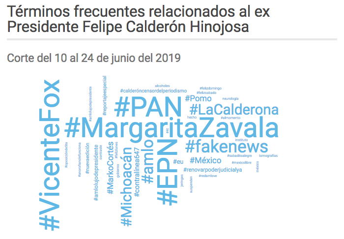 Una muestra de tuits obtenida durante el 24 y 25 de junio permitió visualizar una parte de la red que ubica a al menos tres ex presidentes: Felipe Calderón, Vicente Fox y Enrique Peña; los tres generan burbujas de discusión que se interconectan al interior de esa red. De acuerdo con la información recolectada, la carga que llevan estas burbujas no rebasa en ninguno de los tres casos el 10 por ciento de comentarios positivos, de acuerdo con las cifras de la herramienta de análisis de Twitter, Tweet Binder.
