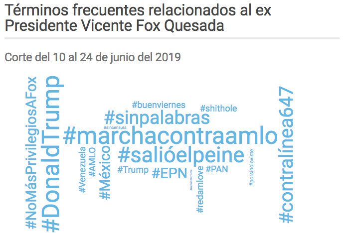 Además, otros temas que saltan en esta muestra vinculan a Vicente Fox con excesos de poder y privilegios, esto debido a que varias semanas después de que solicitara la protección de una guardia personal al Presidente Andrés Manuel López Obrador, la etiqueta #NoMásPrivilegiosAFox permanece como lo más trascendente en las discusiones en torno al ex Presidente panista.