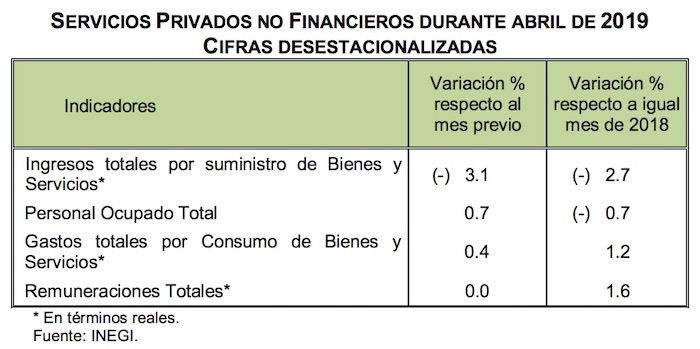 Ciudad de México, 25 de junio (Economía Hoy).- Los ingresos de las empresas del sector servicios registraron en abril de 2019 una contracción de 2.7 por ciento con respecto a su nivel del mismo mes del 2018, lo que representa su primera caída a tasa anual desde marzo de 2018.