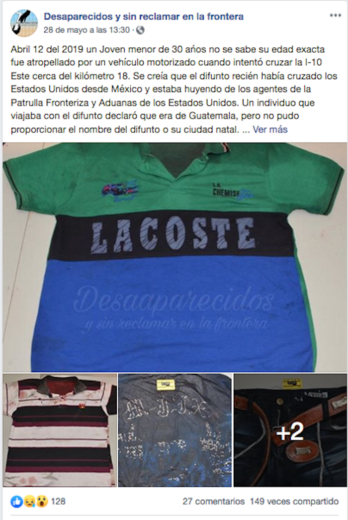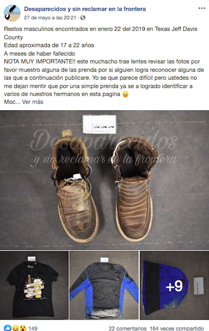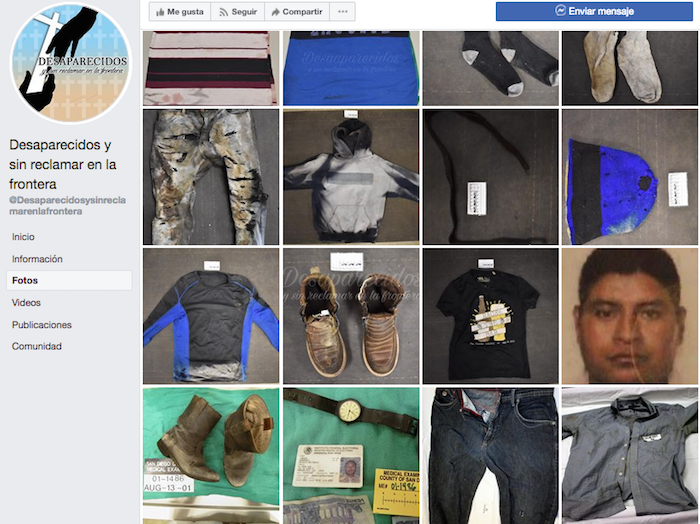 El 25 de mayo del 2015 fue creada la página "Desaparecidos y sinreclamar en la frontera". En ella los administradores han compartido centenas de fotografías con ropa, calzado, mochilas, identificaciones, así como restos óseos de cuerpos encontrados en la frontera mexicoamericana. Cualquier aspecto que sirva para identificar estos cuerpos es difundido en esta página que funciona como una base de datos de migrantes fallecidos en su trayectoria que no han podido ser identificados.