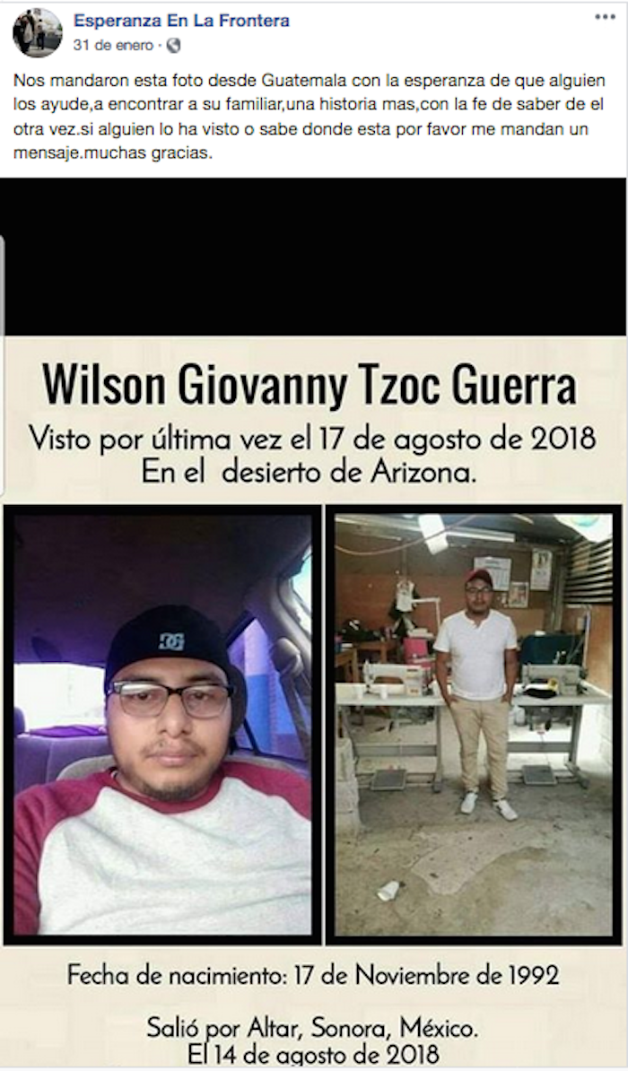 Todo mi agradecimiento y respeto para todas aquellas personas que me apoyan en la búsqueda de familiares de personas localizadas en su intento de cruzar la frontera, gracias a usted mi publicación del día 28 de julio de 2018, un caso que me envió el director namus Dustin Driscoll de la base de datos NamUs.gov acerca de el cuerpo de un hombre encontrado en el desierto llegó exactamente a donde queríamos que llegara a las manos de su familia y fue a su esposa #Cecilia quien se puso en contacto conmigo ( 6 de septiembre) para pedir más datos ya que los tatuajes que eran los nombres de sus hijos "Juan" "Gerardo", la fecha, edad, cruce de frontera, trabajo dental coincidía con su querido esposo, el señor JOSÉ GERARDO CABRERA TORRES originario de ##misantla ##Veracruz y con quien había tenido su última comunicación desde el día 30 de mayo de este mismo año. Por mi parte me puse en contacto con la organización Equipo Colibri para empezar un proceso e identificar a este hombre y gracias al doctor Anderson de la morgue de tucson, él mismo día confirmó que se trata de José Gerardo. Muy pronto descansará en paz n su tierra natal. D.E.P