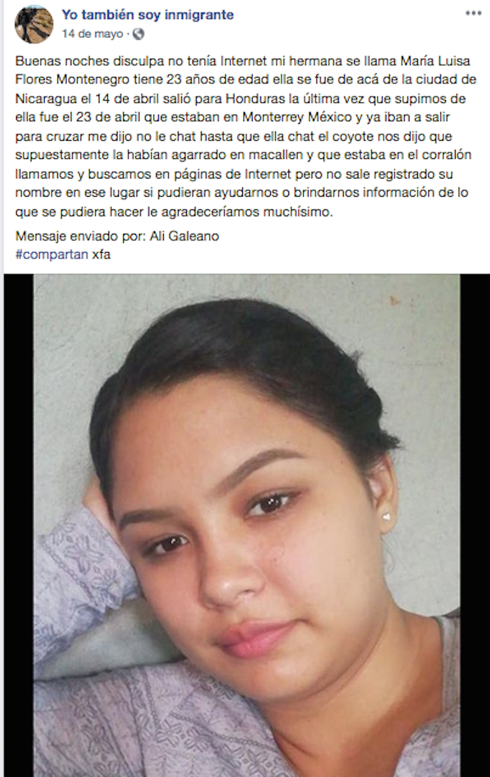 Mientras estos activistas difunden en la red social de Mark Zuckerberg fotografías de carácter forense, cientos de personas comparten fotografías de sus seres queridos con la esperanza de que algún usuario de la plataforma les identifique. Estas imágenes proceden de todo Latinoamérica y también existen páginas orientadas a compartirlas. Entre este tipo de comunidades destacan páginas como “Migrantes no Identificados ‘una luz de esperanza’”, creada desde el 2015 y con más de 38 mil seguidores.