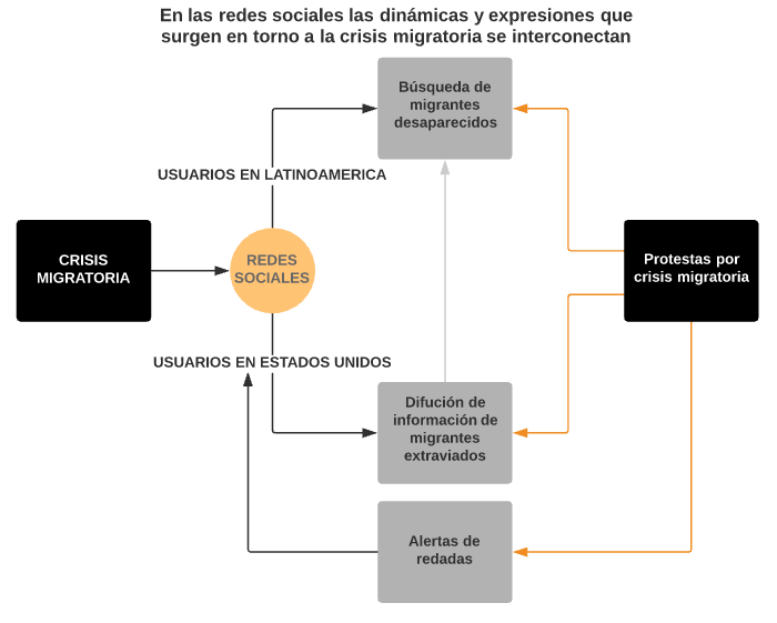 Las dinámicas que emergen en las redes sociales como producto de la crisis migratoria documentan la dimensión del problema en todas sus escalas, desde el inicio del trayecto hasta el momento en que son detenidos por los agentes de migración. Esto es visible en páginas de Facebook enfocadas en la búsqueda de migrantes desaparecidos y en la alerta de redadas.