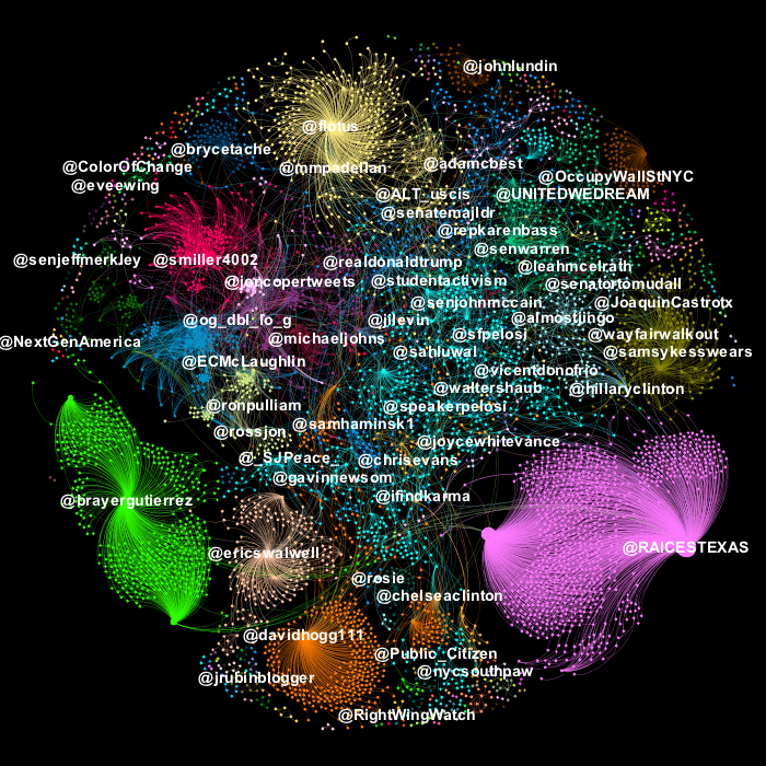 Un análisis a la discusión que se ha generado en torno a esta problemática en Twitter, muestra el impulso que han adquirido ciertos actores políticos en las protestas, destaca el caso de los senadores Bernard Sanders, Elizabeth Warren, la Presidenta de la Cámara de Representantes de EU, Nancy Pelosy, y el Gobnerador de California, Gavin Newsom, junto a ellos activistas y organizaciones civiles se posicionan en esta red por reclamar la protección de los derechos de los migrantes, entre ellos agrupaciones como IL Immigrant Rights.