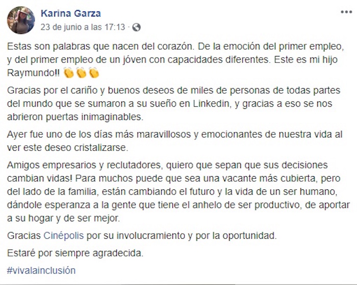 "Para muchos puede que sea una vacante más, pero están cambiando el futuro y la vida de un ser humano, dándole esperanza a la gente que tiene el anhelo de ser productivo y de ser mejor”, expresó la mamá de Raymundo en redes sociales.