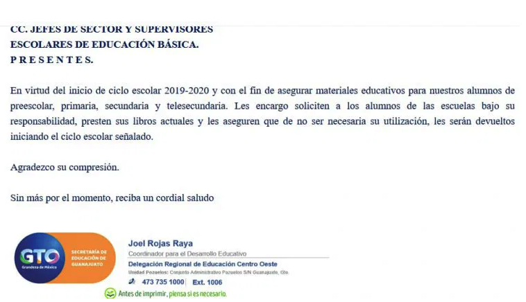 “En virtud del inicio del ciclo escolar 2019-2020 y con el fin de asegurar materiales educativos para nuestros alumnos de preescolar, primaria, secundaria y telesecundaria. Les encargo soliciten a los alumnos de las escuelas bajo su responsabilidad presten sus libros actuales y les aseguren que no ser necesaria su utilización, les serán devueltos iniciando el ciclo escolar señalado”.