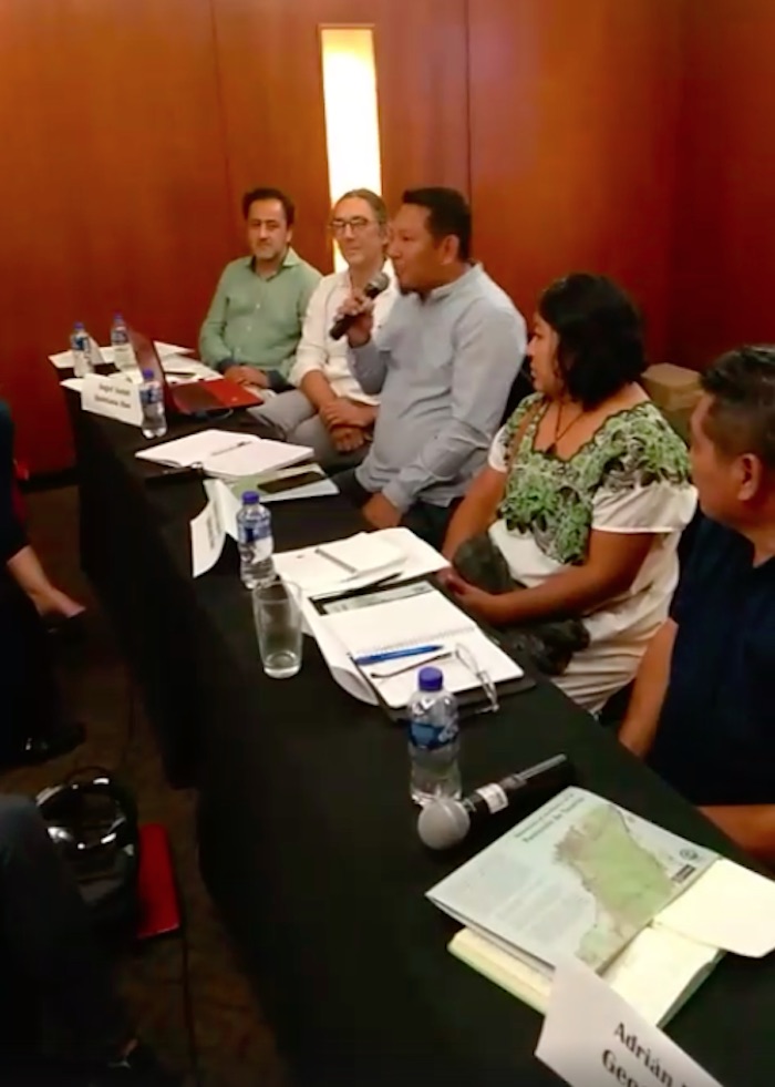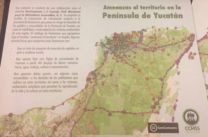 Pedro Uc, maya de Yucatán, expuso que en la península se han talado miles de hectáreas de árboles para instalar parques eólicos; las granjas de hasta 50 mil puercos canalizan la suciedad a sus cenotes sagrados; los menonitas han convertido en desierto a sus selvas altas y silenciado a sus aves para la siembra de soya transgénica con maquinaria; y el turismo verde que busca cenotes y sitios arqueológicos los ha expulsado de su propia tierra.