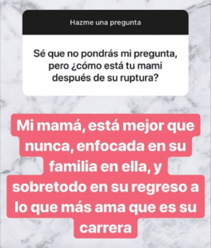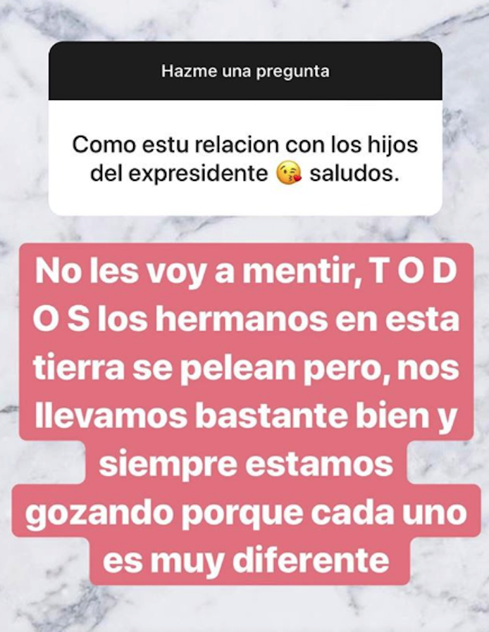 Por otra parte, la segunda hija de la actriz, Fernanda Castro, respondió algunas preguntas hechas por sus seguidores en Instagram, algunas de las cuales le cuestionaban acerca de su madre y cómo enfrentó su ruptura con el ex mandatario.