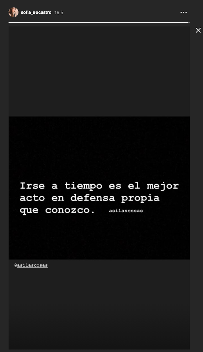"Irse a tiempo es el mejor acto en defensa propia que conozco", publicó la joven ayer por la noche en las historias de su cuenta de Instagram, las cuales permanecen visibles a sus seguidores sólo por 24 horas.