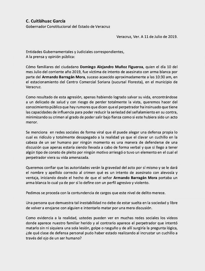 “Queremos confiar que las autoridades verán la gravedad del acto por sí mismo y se le dará el nombre y apellido correcto al crimen qué es un intento de asesinato con alevosía y ventaja, iniciando desde el hecho de que el señor Armando Barragán Mora portaba un arma blanca lo cual ya de por sí lo define con un perfil agresivo y violento. Pedimos se proceda con la contundencia de cargos que este nivel de delito merece”.