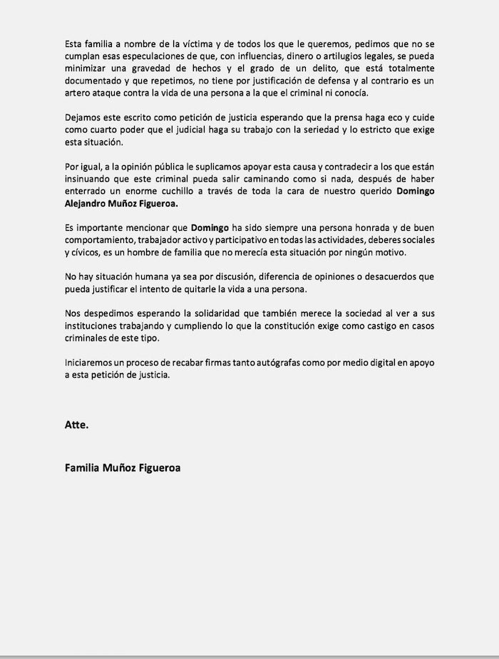 Además pidieron a la opinión pública apoyar la causa y contradecir a los que están insinuando que este criminal pueda salir caminando como si nada, luego de haber enterrado un enorme cuchillo a través de toda la cara de nuestro querido Domingo Alejandro Muñoz Figueroa.