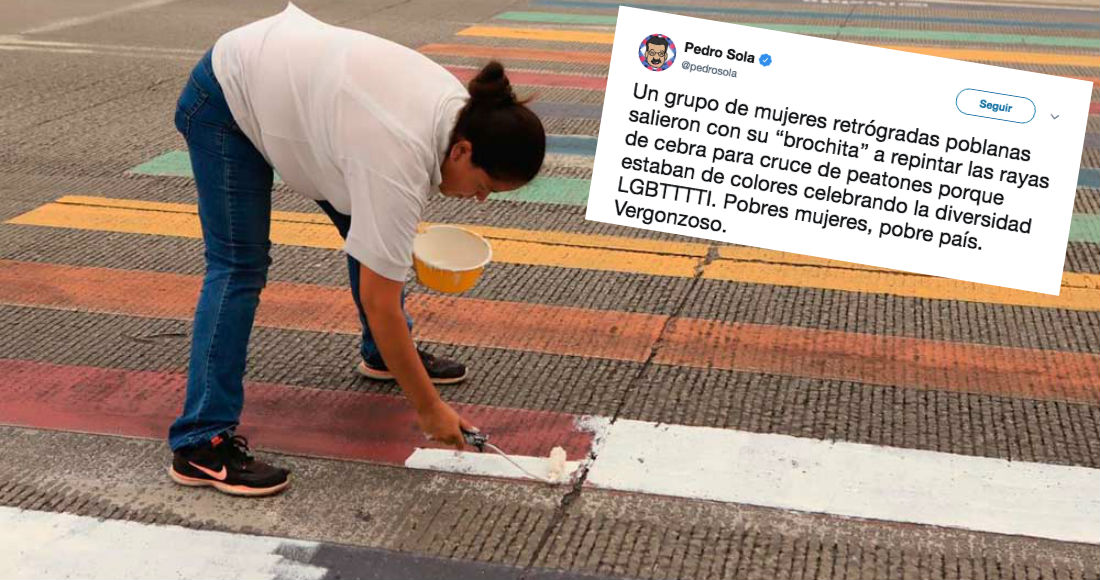 Un grupo de mujeres retrógradas poblanas salieron con su “brochita” a repintar las rayas de cebra para cruce de peatones porque estaban de colores celebrando la diversidad LGBTTTTI. Pobres mujeres, pobre país. Vergonzoso.
