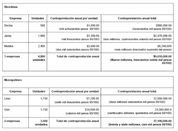 Dezba, que es una empresa mexicana que estaba operando con 100 bicicletas, pagó la contraprestación de 900 mil pesos y tiene permiso para operar 500 bicicletas; Jump, una empresa a nivel mundial, pagó la contraprestación de 2 millones 470 mil pesos tiene permiso para operar 1,900 unidades.