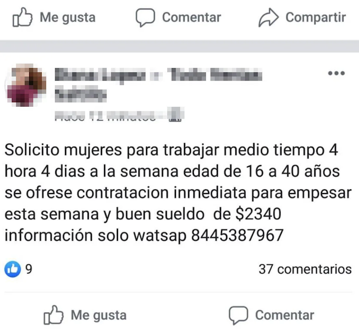 En páginas de la web, el perfil de Diana López realiza las publicaciones. “Solicito mujeres para trabajar medio tiempo (4 horas), 4 días a la semana, edad entre 16 a 40 años; se ofrece contratación inmediata para empezar esta semana; buen sueldo de 2 mil 340 pesos”, anuncia.