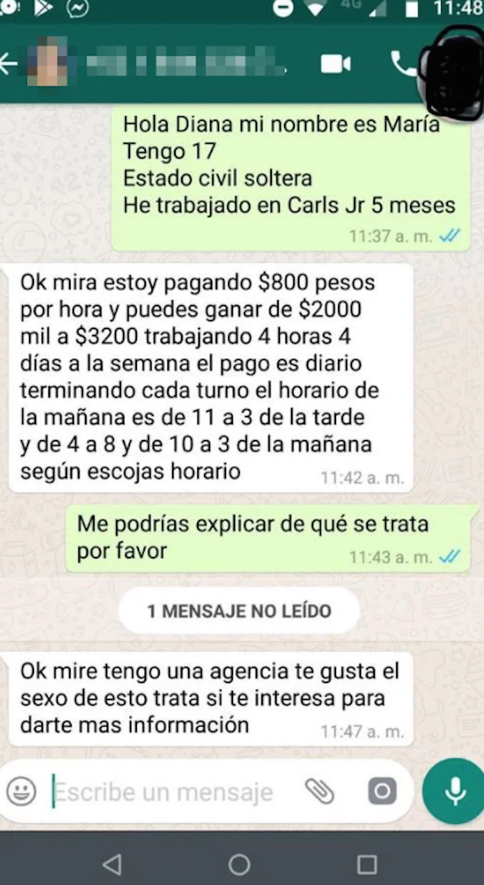 Finalmente, el contacto explica que el trabajo es brindar sexo a cambio de dinero.