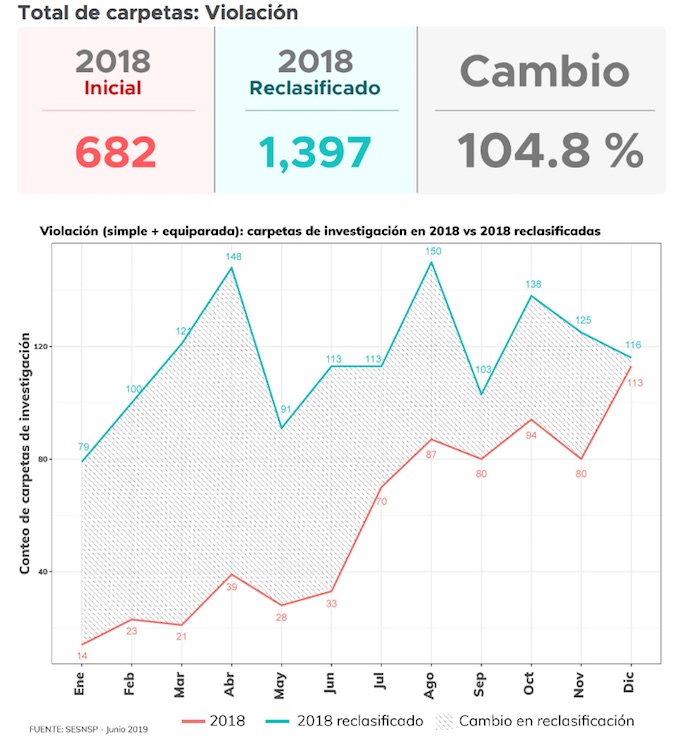 En el caso del delito de violación, la cifra creció, después de la revisión, en 104.8 por ciento, pues inicialmente se reportó 682 carpetas abiertas en 2018, pero se hallaron un total de mil 397. El robo a transeúnte con violencia, fue el delito con el segundo ajuste al alza más grande, pues después de la revisión incrementó en un 176.4 por ciento. En un inicio se encontraron 8 mil 604 carpetas abiertas por este delito, y después de la reclasificación quedó en 23 mil 784.