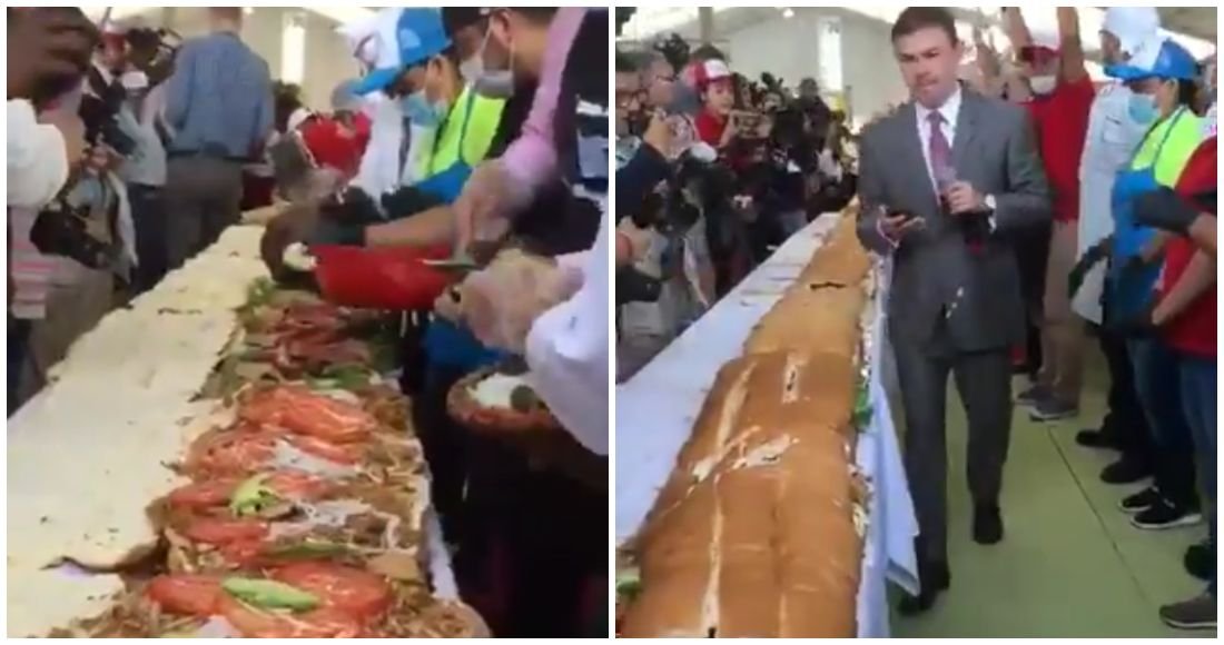 Cocineros de todo el país prepararon la torta, una especie de emparedado, en menos de tres minutos en la capital mexicana. Midió 72 metros de largo y tuvo jamón, carne de res, mariscos y otros rellenos.