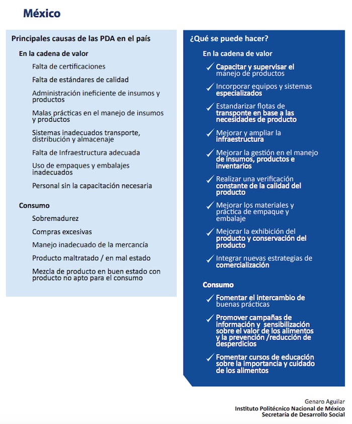 Genaro Aguilar indicó que una medida que podría ayudar a contrarrestar el desperdicio de alimentos sería sugerir al sector restaurantero y hotelero que sean más eficientes con el tamaño de las raciones que sirven, ya que la mayoría tiende a dar cantidades mayores en relación a lo que una persona consume. Lo anterior también aplica para los hogares.
