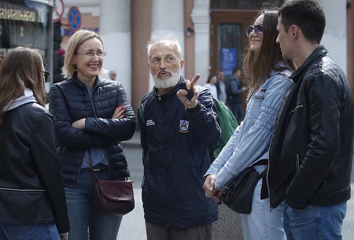 Todos los días Vyacheslav Rasner, de 68 años de edad, se planta en las afueras de la estación del metro de las nueve de la mañana a las tres de la tarde, tratando de conseguir clientes para llevarlos a conocer la calle principal, la Nevsky Prospekt. A veces llega a reunir 30 personas para un paseo.