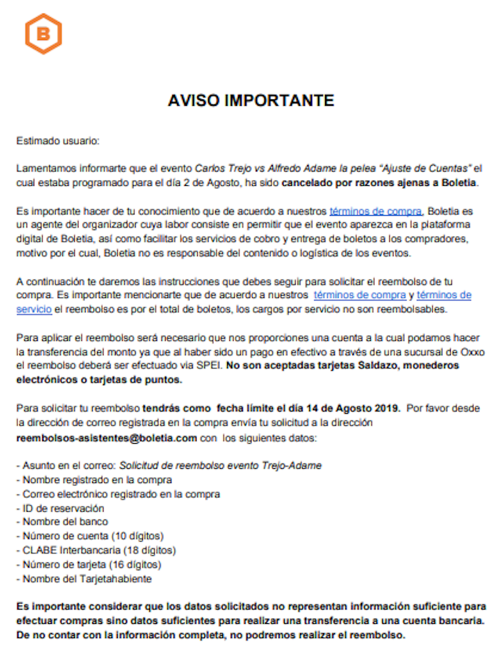 Sin embargo, aún permanece la incertidumbre sobre si cambiará de fecha o de plano quedará cancelada Boletia, el servicio a través del cual comenzaron a venderse los boletos para la pelea “Ajuste de cuentas”, ya emitió un comunicado en el que da a conocer a los usuarios cómo llevar a cabo su reembolso.