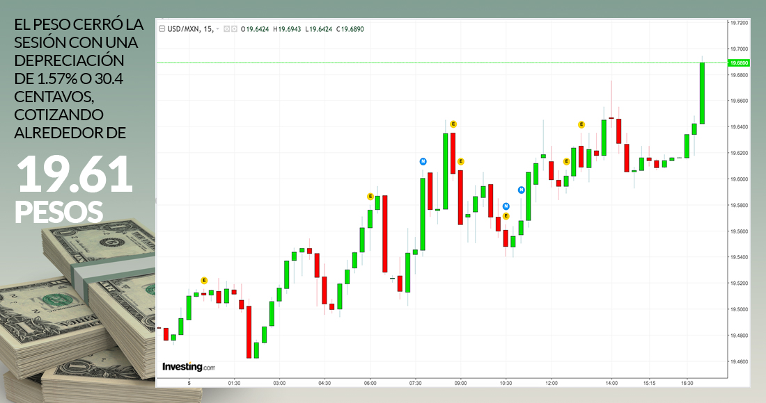 Ciudad de México, 5 de agosto (SinEmbargo).- Las nuevas amenazas arancelarias entre China y Estados Unidos llevaron a los mercados globales a mostrar pérdidas. En México el peso cerró la sesión con una depreciación de 1.57 por ciento, o 30.4 centavos, y el el IPC (S&P/BMV IPC) de la Bolsa Mexicana de Valores (BMV) cerró con resultados negativos por quinto día consecutivo, a la par de la fuerte aversión al riesgo observada a nivel global, operando en niveles de noviembre y vistos por última vez en 2014.
