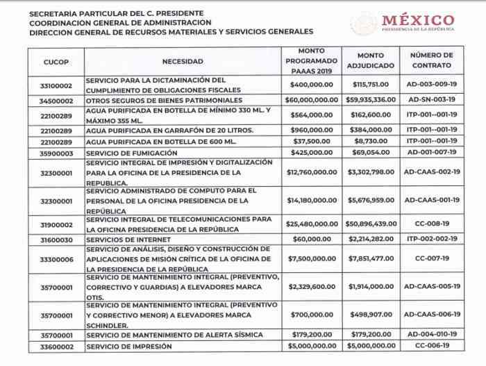 Hasta el momento, la Presidencia de la República no ha emitido ninguna declaración sobre los altos precios y gastos que se conocieron este lunes, desglosados del documento oficial ‘Programa Anual de Adquisiciones, Arrendamientos y Servicios’, de 68 cuartillas en total, que se divide los rubros de: Licitación Pública (LP), Adjudicación Directa (AD) e Invitación a cuando menos tres personas (I3P).