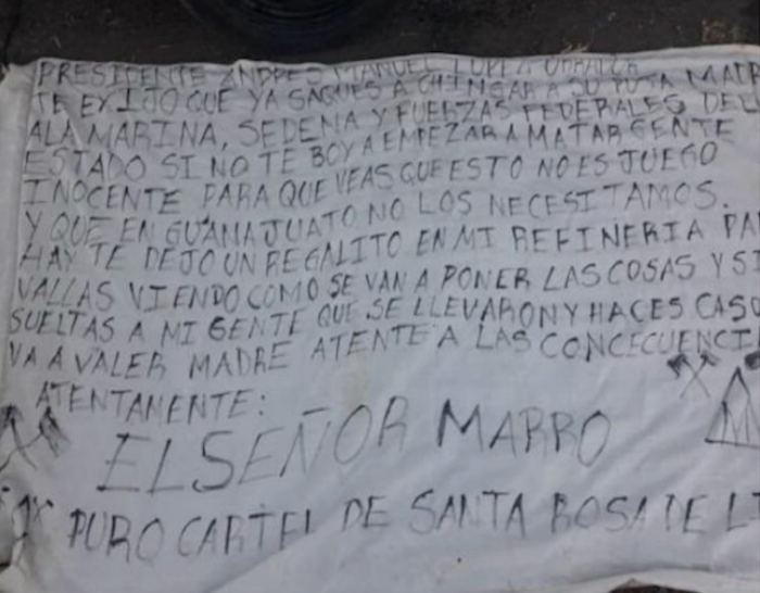 La primera de las llamadas “narcomantas” —pancartas con mensajes de organizaciones criminales— dirigidas al Presidente Andrés Manuel López Obrador (AMLO) apareció en Guanajuato en enero de 2019. Supuestamente estaba firmada por José Antonio Yépez Ortiz, alias “El Marro”, líder del Cártel de Santa Rosa de Lima, grupo dedicado al robo de petróleo.