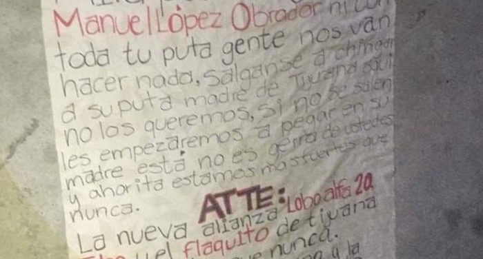 Luego apareció una “narcomanta” del Cártel Arellano Félix en Tijuana. El mensaje también estaba dirigido a López Obrador, y amenazaba con tomar represalias por haber desplegado mil 800 efectivos en el estado.