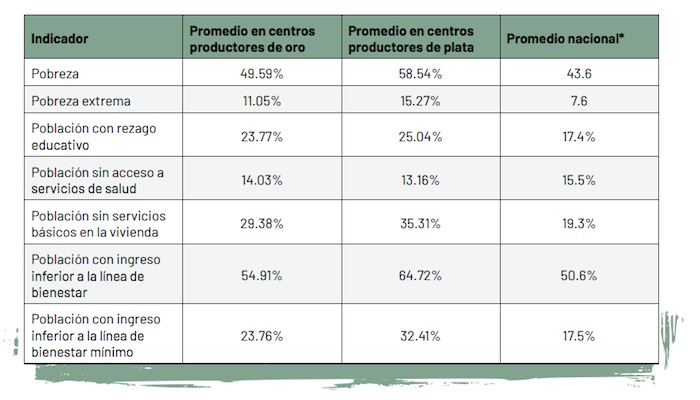 En los centros productores de oro, como Caborca, Mazapil, Ocampo, la pobreza se registra en el 50 por ciento de sus habitantes; el ingreso del 55 por ciento es menor a la línea de bienestar; y un 29 por ciento carece de servicios básicos en los hogares.